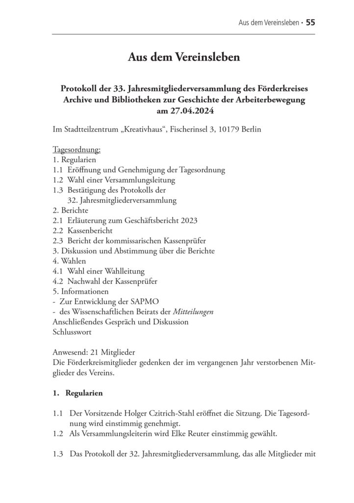 27.04.2024 Protokoll admin 14. September 2024 Protokolle Protokoll der 33. Jahresmitgliederversammlung des Förderkreises Archive und Bibliotheken zur Geschichte der Arbeiterbewegung am 27.04.2024. Please follow and like us: